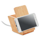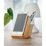 Double coil wireless charger for 1 device in bamboo casing and with stand and pen holder functionality. Output: DC5V/1A (5W). Bamboo is a natural product, there may be slight variations in colour and size per item, which can affect the final decoration o