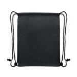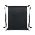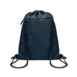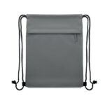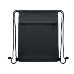 Drawstring bag with PU coated 600D RPET polyester and 190T RPET polyester lining. Zippered front pocket.