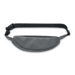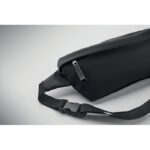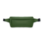 Waist bag with PU coated 600D RPET polyester, 210D RPET polyester lining and front zippered pocket.