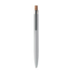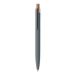 Push ball pen in recycled aluminium with cork detail button and metal clip. Blue ink.
