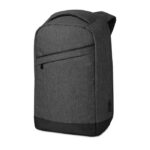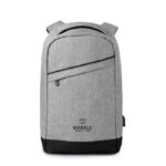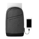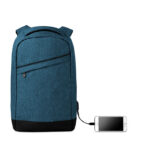 600D 2 tone Polyester backpack with padded shoulder strap with main internal compartment. Includes one internal 13” laptop compartment and an USB charging cable. Zipper main compartment on backside for better protection.