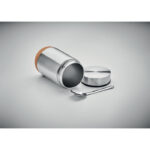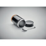 Double wall stainless steel insulated storage jar with a screw top and cork base detail. Includes spoon. Capacity: 400ml. Cork is 100% natural material. Due to its structural nature and surface porosity the final print result per item may have deviations.