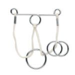 Set of 2 metal, wood and cotton cord brain teasers: 2 and 4 pieces respectively. Presented in a recycled paper box.