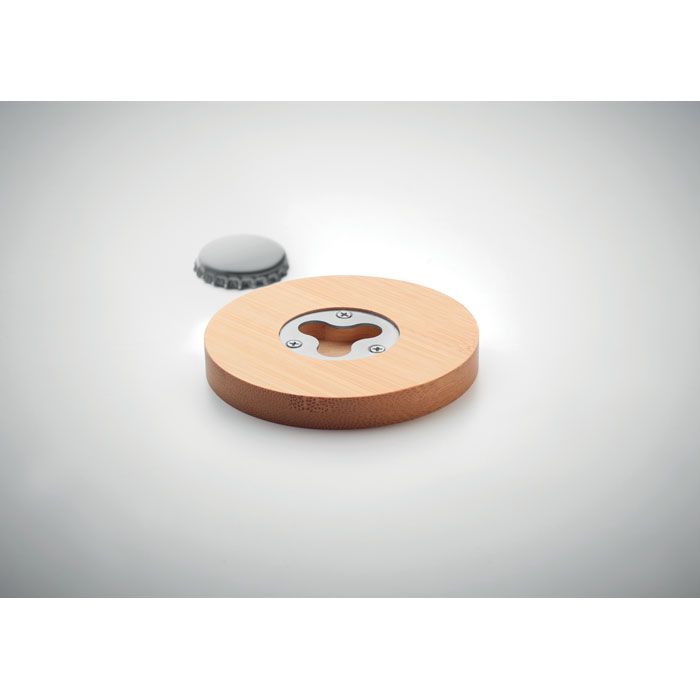 Bamboo bottle opener with coaster function. Bamboo is a natural product, there may be slight variations in colour and size per item, which can affect the final decoration outcome.