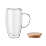 Double wall borosilicate glass mug with handle and bamboo lid. Capacity: 450 ml.