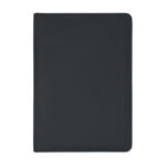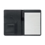 A5 portfolio in 2 tone 300D RPET. Replaceable A5 notepad. 40 white lined bamboo paper pages (20 sheets). Pen holder. Cardholders inner side and one big compartment.