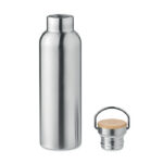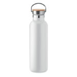 Double wall Stainless Steel insulating vacuum flask with bamboo lid and carry handle. Capacity: 750 ml. Leak free. Bamboo is a natural product, there may be slight variations in colour and size per item, which can affect the final decoration outcome.