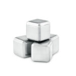 Set of 4 reusable stainless steel ice cubes in velvet pouch.