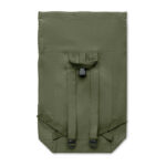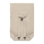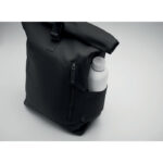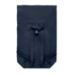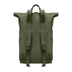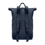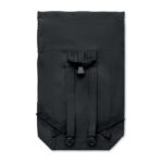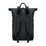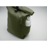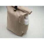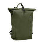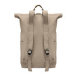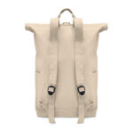 Roll top backpack with hook and loop closure in 390 gr/m² recycled cotton (80%) and recycled polyester (20%). Zippered front pocket.