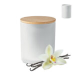 Fragranced plant based wax candle in frosted glass jar holder with bamboo lid. 200 gr. Burn time: 33 hours. Presented in a paper tube gift box. Bamboo is a natural product, there may be slight variations in colour and size per item, which can affect the final decoration outcome.