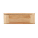 Bamboo lunch box with removable divider and attachable elastic nylon strap. Dry food only. Capacity: 1000ml. Bamboo is a natural product, there may be slight variations in colour and size per item, which can affect the final decoration outcome.