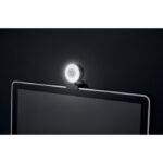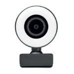 Streaming 1080P HD webcam in ABS with built-in microphone and adjustable ring light.