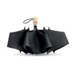 23 inch 3 fold auto open/close reversible umbrella in 190T pongee RPET. Fibre-glass ribs. Bamboo handle with cotton wrist strap. Includes matching RPET pouch. Bamboo is a natural product, there may be slight variations in colour and size per item, which can affect the final decoration outcome.