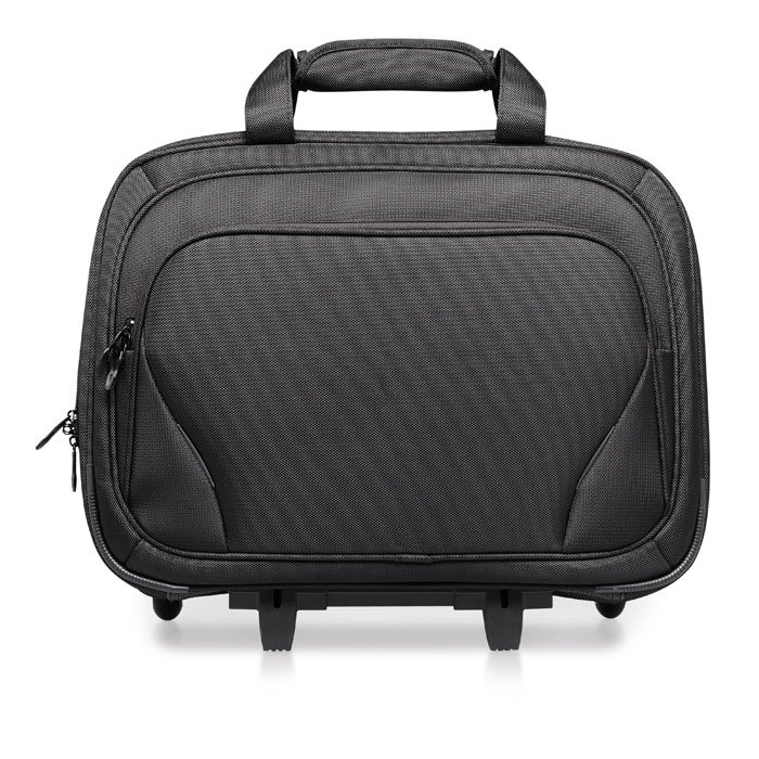 Business trolley including a 17 inch laptop pocket and 10 inch tablet pocket with several compartments. 1680D polyester.