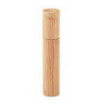 Mini perfume refillable atomiser bottle with bamboo casing. Capacity: 10 ml. Bamboo is a natural product, there may be slight variations in colour and size per item, which can affect the final decoration outcome.