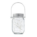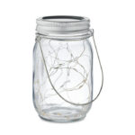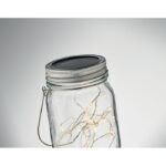 Solar mason jar outdoor lamp with 20 LED fairy string lights. Hanger on top. Approx. 5 hours working time. Battery 300 mAh NI-MH included. IP44.