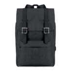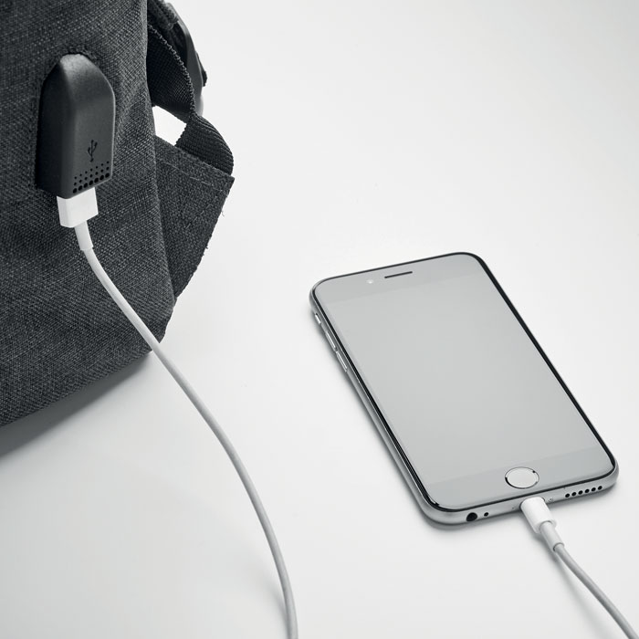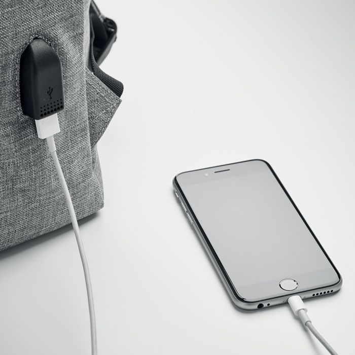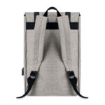 Laptop backpack in 600D 2 tone polyester with padded shoulder strap including one main internal compartment for 15 inch laptop and a USB charging cable. Includes magnetic snap button closure and one zippered front compartment.