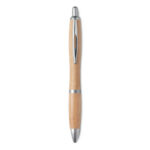 Push button ball pen with bamboo barrel and ABS fittings. Blue ink. Bamboo is a natural product, there may be slight variations in colour and size per item, which can affect the final decoration outcome.