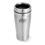 Double wall stainless steel travel cup with black PP lid. Capacity: 400 ml.