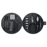 25 piece tool set in tyre shaped box including 1 extender, 1 socket screwdriver, 1 nose plier, 5 sockets, 3 hex keys, 10 bits set, 2 precision screwdrivers and 1 tape.