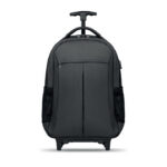 Backpack trolley in 360D 2 tone polyester. Includes one internal 15 inch laptop compartment and one main front part with zipper pocket. Padded back and shoulder straps. Includes Tablet compartment. Has an integrated sleeve for protecting the wheels when carrying.