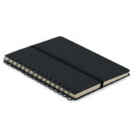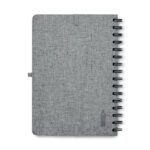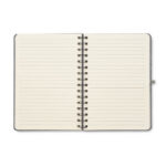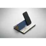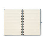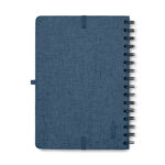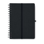 A5 notebook with 600D RPET hard cover with smartphone stand function. Twin-wire. 160 lined pages (80 sheets). 70 gsm recycled paper. Elastic closure strap.