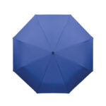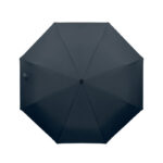 Foldable 21” windproof umbrella with full black plating fibreglass frame with 2 sections. Fibreglass ribs. 190T RPET pongee panels. D shape carabiner handle w/ rubber finish. Auto open and closure. Includes pouch