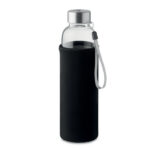 Single wall in high borosilicate glass bottle with tea infuser and neoprene pouch. Capacity 500 ml. Not suitable for carbonated drinks. Leak free. Laser engraving is not possible on borosilicate glass.