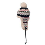Knitted beanie with ear flaps and pompom in acrylic fibre with polyester and fleece lined. Includes label for printing area on one side. Adult size.