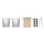 Viski serveerimise komplekt, kuhu kuuluvad 2 klaasi (300ml), 8 korduvkasutatavat kivist jääkuubikut ja tangid. Komplekt tuleb eksklusiivses bambusest kinkekarbis.