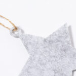 Kolm pehmet jõulukaunistust: kuusk, täht ja pall. Kõik kaunistused on riputatavad ja pakitud taaskasutatud paberkotti