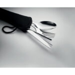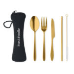 Re-usable stainless steel cutlery set including fork, knife, spoon, straw and brush in neoprene pouch.