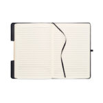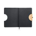 A5 notebook with 600D RPET hard cover with bamboo detail with a smartphone stand function. Casebound. 160 lined pages (80 sheets). 70 gsm recycled paper. Matching elastic closure strap, ribbon page-marker and pen holder. Take this office essential with you to your next meeting. Having a remote meeting? Fold open the phone holder and put in your device so you don’t have to hold it yourself. FSC®-certified | FSC MIX CREDIT, P7.1, FSC-C213206