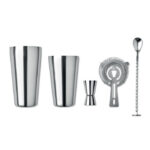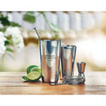 Stainless steel cocktail set with 750 ml shaker, measuring jug (30 ml) and sieve in cotton pouch.