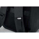Laptop backpack 16” in 300D RPET polyester and 210D polyester lining. Water-resistant fabric. Hidden zippered pocket and trolley holder on the back. Padded internal laptop compartment, mesh back and shoulder strap.