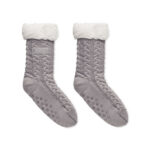 Pair of cable knit slipper socks with non-slip grippers on the bottom in Acrylic twine and 240 gr/m² faux sherpa lining. Presented in giftbox. Size M= 36-39.