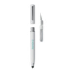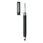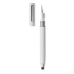 Twist action ball pen with stylus in ABS. It has a True Wireless Stereo (TWS) earbud cleaning kit: metal nib, sponge and brush. Blue ink.