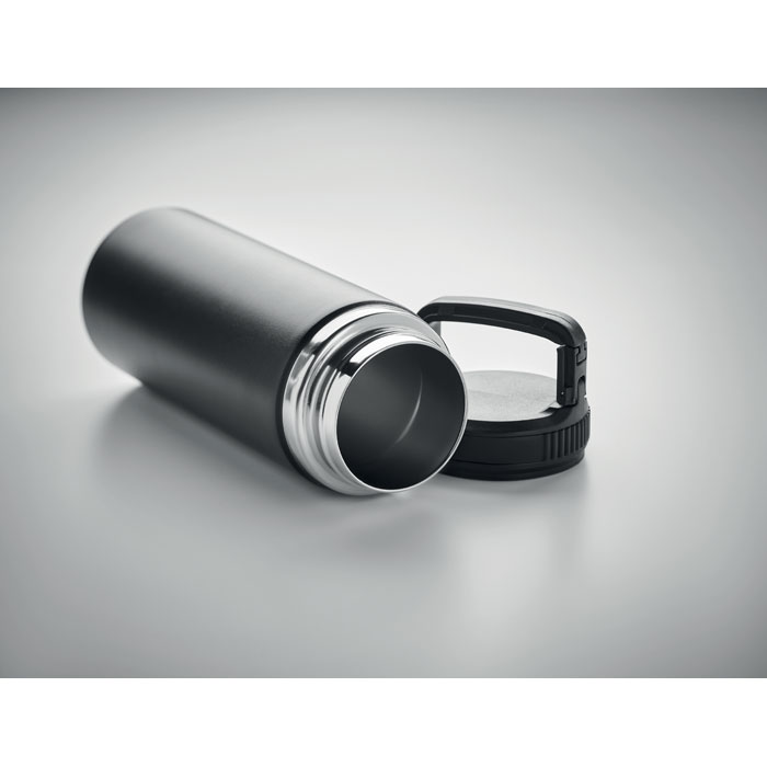 Double wall stainless steel vacuum insulated bottle with hook hanger on lid. Capacity : 500 ml.