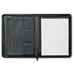A4 conference folder with bonded leather cover. Zipped. 25 plain sheets notepad. 4 inner compartments. Pen holder.