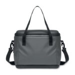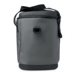 Cooler bag in 50C tarpaulin and top/bottom in rigid PEVA and bottle opener on the side. Including 1 front pocket and 1 inner mesh pocket. Isolation material: PE foam layer. Includes 2 handles and 1 adjustable and detachable strap. Capacity 16L.