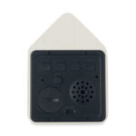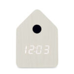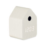 Small MDF desk clock including a built-in alarm with bird cuckoo voice and temperature display. Bird cuckoo voice every full hour and during alarm. White LED display. Sound is automatically silenced between 22.00h to 06.00h. 5 mins snooze intervals