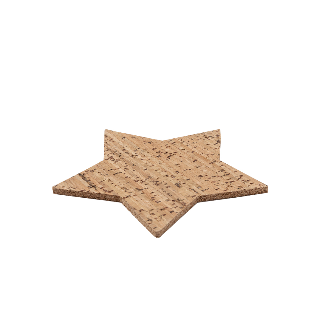 4-osaline joogialuste komplekt, valmistatud looduslikust korgist. Iga aluse kuju on täht ja komplekt on pakitud stiilsesse kraftpaberkarpi, millel on lõigatud tähekujundus. Valmistatud taimsetest elementidest, et toetada looduslike toorainete kasutamist ja vähendada keskkonnasõbraliku tootmise mõju. Ideaalne kingitus või elegantne lisand jõuluajaks kodus või kontoris