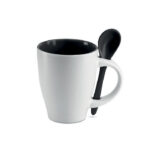 Bicolour ceramic coffee mug of 250 ml capacity with colour matching spoon. Individual box 11,5×10,5×9,3cm.