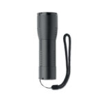Small aluminium zoomable LED flashlight torch and detachable strap. Output: 200 lumen. 3 AA battery excluded.