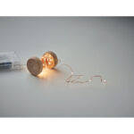 String of 50 LED fairy lights in warm yellow light on a wooden spool. Length: 5m. 3 AA batteries not included.