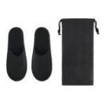 Pair of polyester hotel slippers presented in a non woven pouch. EUR size 43 – 44.