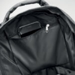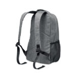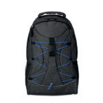 Backpack in 600D 2 tone polyester with colourful contrasting facing and glow in the dark cord on the front panel. Mesh pockets on both sides.