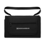 Foldable fleece blanket with plastic coated PEVA reverse side.