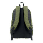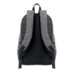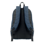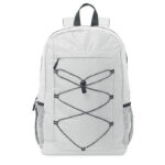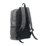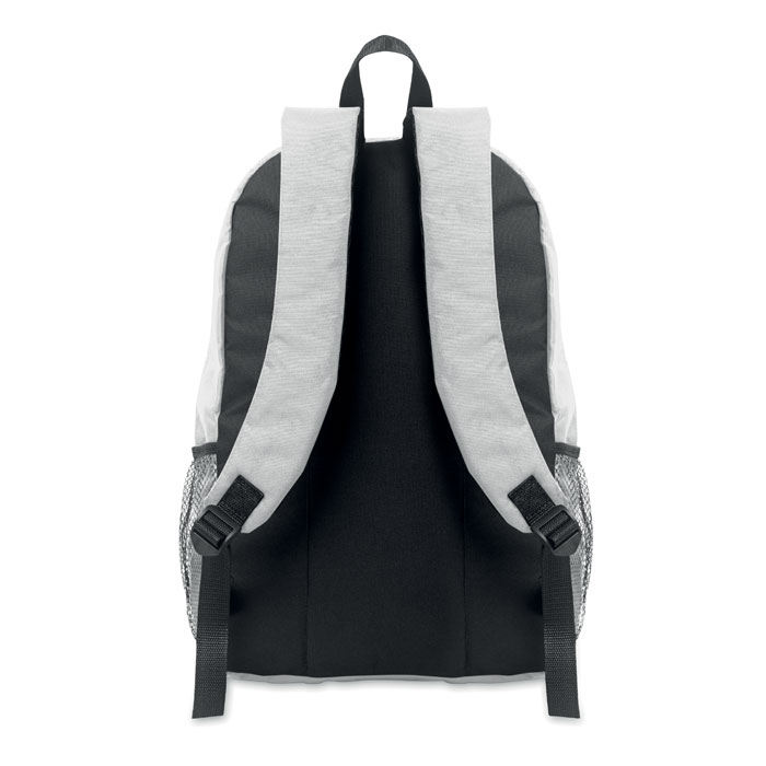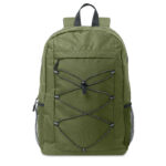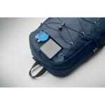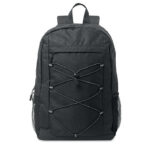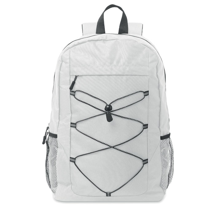 Backpack in 600D RPET polyester with decorating cord and front zippered pocket panel. Mesh pockets on both sides.