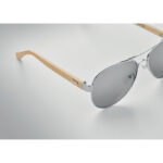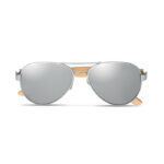 Sunglasses with bamboo arms and coloured mirrored lenses in microfibre pouch. UV400 protection. Bamboo is a natural product, there may be slight variations in colour and size per item, which can affect the final decoration outcome.
